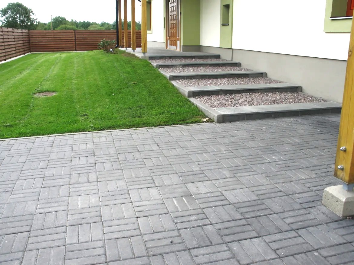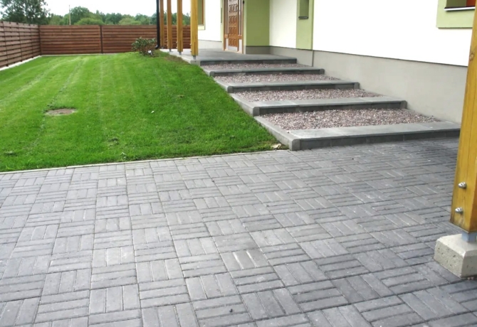 KLOOSTRI bruģa tīrais un ritmiskais ornaments ir saskaņots ar mājas taisnajām līnijām un detaļām, tādējādi tas veido vienotu un pārdomātu ārtelpu.